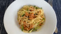 サバと青梗菜のパスタ 2021.09.25 カルディで買ったさばの塩レモンのパスタソースで、青梗菜を加えたパターン。安定のおいしさで、何を加えるかという楽しみがあるソースです。青魚にはレモン風味にするのがコツなのだなあと、後日作ったパスタで改めて気づきました。