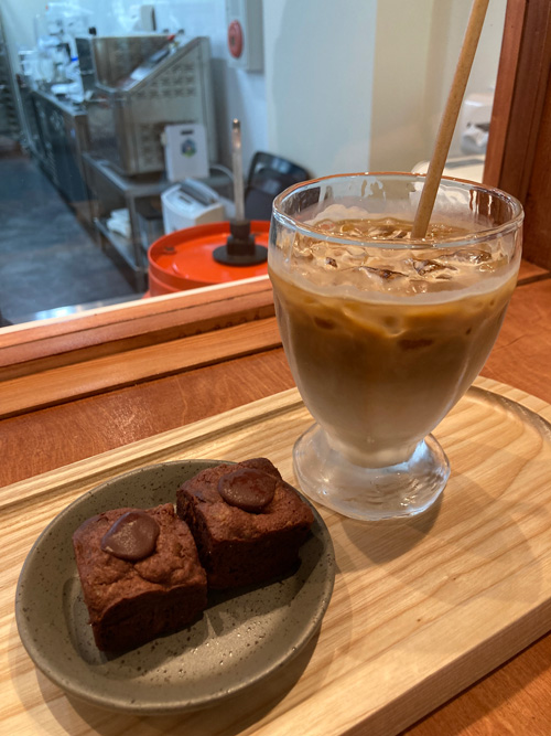 ウォーキング途中で夫が見つけたというこちらのチョコレート屋さんのカフェで一休み。暑かったのでアイスカフェラテ450円と、おやつにはマッドスライドクッキー420円にしました。
