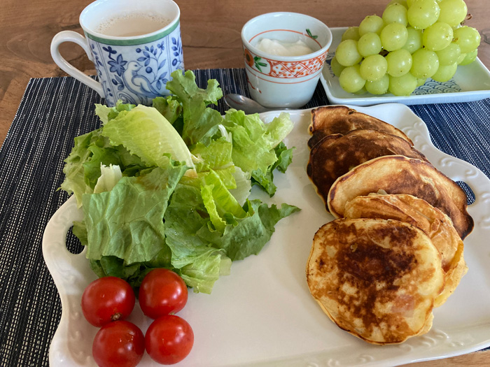 休日の余裕がある朝だからこそできる内容です。じゃがいもをすりおろして入れているのでもちもちしています。ケチャップを付けるとよりおいしくいただけました。