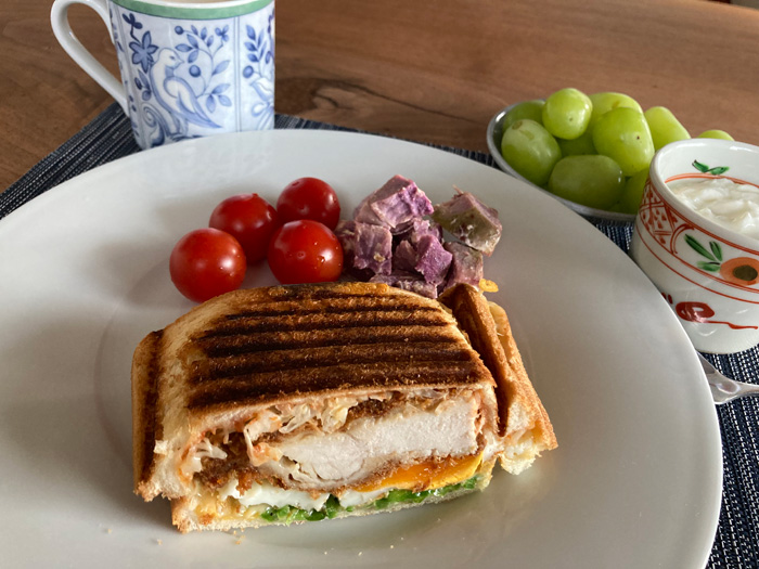 惣菜店の大きなチキンカツはそのまま食べるには大きすぎたので、4等分して冷凍していました。その一切れを使ってホットサンド。その他は甘長唐辛子を刻んだのと、目玉焼き、キャベツ、スライスチェダーチーズです。チキンカツサンドがあと3回できてしまうので、しばらく楽しみです。