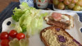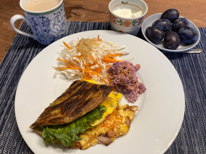 改めて、何か具を挟めばよいということがわかり、残り1枚にレタスやチーズ、ベーコンオムレツをサンドしてみました。ケチャップで味付けです。これはよい。今度からちゃんと何かを挟んで一人1枚とすることにしようと思います。