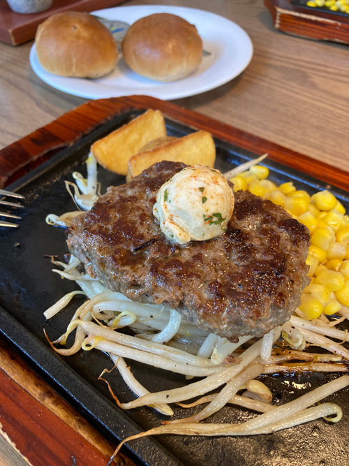 しばらくしてジュウジュウと音を立ててハンバーグステーキの皿が運ばれてきました。ソースはいろいろ選べますが、名前が冠されたせんごくバターにしました。これは大正解。パンも付けたりしました。ちゃんとパン用についてきていますが。