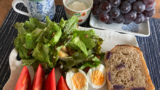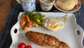 芯に近い方のキャベツなのでほぼ黄色ですが、キャベツの千切りとスライスチーズとチキンカツをサンドしました。掛けたのはお好みソースかな。人参とじゃが芋はチンしただけのものに姜葱醤(ジャンツォンジャン)を和えただけのホットサラダ。