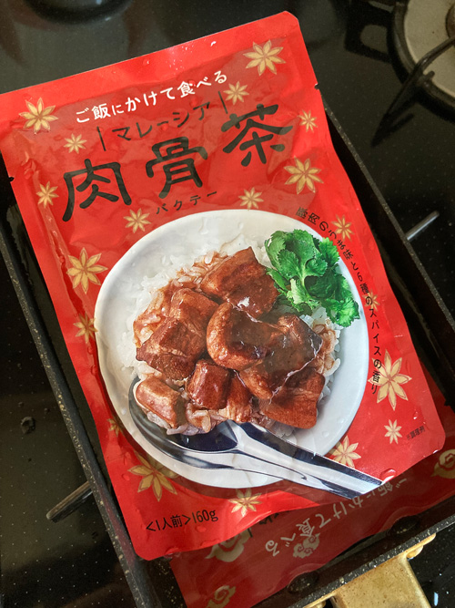 お昼ごはんのために色々なレトルトを買い込んでいます。これはパッケージが真っ赤で目を引いて、しかもバクテーだったので一も二もなく購入しました。上記の写真が量が少ないのは、もう一種類ごま味噌坦坦も一緒に買い、半分ずつ味を観ようということになったので。