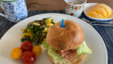 昨日買ったコッペパンにベーコンの長さをそのまま生かせそうだなと思い、グリルしたのとオムレツをサンドしました。オイル漬け黒胡椒は使いどころがよく分からないので、こんな感じでえいっと乗せました。