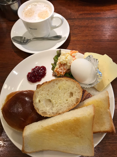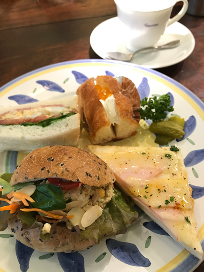 勿論、全種類を盛り合わせる「全パン」で、そしてゆで卵60円とゴーダチーズ60円を追加して都合600円となります。飲み物は決まってカフェ・オ・レ。