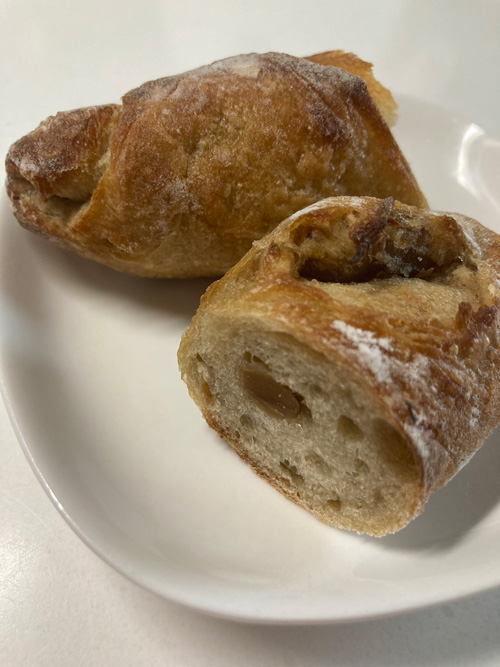 マロングラッセとヘーゼルナッツのバゲット。エスプレッソ漬けのヘーゼルナッツが効いています。