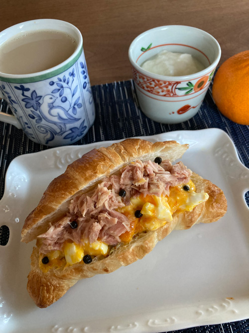 クロワッサンは茹で卵をつぶしてマヨネーズと和えたのとツナと生黒胡椒で。