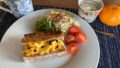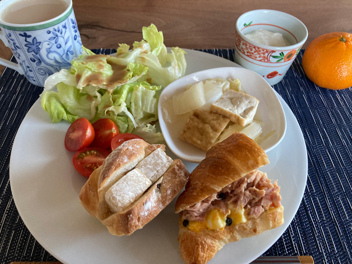 昨日のウォーキングの途中の住宅街で出会ったパン屋さんのパンでサンドウィッチ2種。