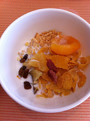 シリアルは5種類あるし、あんまり混ぜると訳が判らないのでライスパフとコーンフレークに留めて。