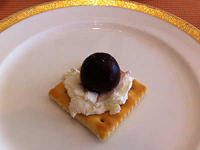 クラッカーの上にクリームチーズを塗り、その上にぶどうのコンポートを。