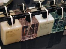 環境に配慮してディスペンサータイプをご用意、と書いてあったので、趣のないものを勝手に想像していましたが、どうしてなかなか素敵ボトルです。ハンドソープ、ボディソープ、コンディショナー、シャンプー。ホント云うと全部欲しいんだけど、これは備品にあたるのでダメな模様。