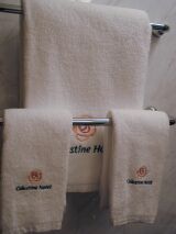 タオルにはロゴとマークが刺繍されて可愛らしいアクセントにバスローブにも同く。