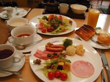 お米もお味噌も何やら自慢の物らしいので、連れはそれをオーダーすると、小ぶりのお盆にご飯とお味噌汁のセットが運ばれてきました。おままごとのようで可愛い。味も良い模様。和食の人も洋食の人もビュッフェから取ります。鹿児島も何やらやたらと因んでいるので、そのせいかサラダにさつま芋がありました。緑茶は鹿児島産。(九州もお茶処なのですよ)。温泉卵も嬉しい。トースターを用意するなら、オーブントースターの方が、丸いパンも温められていいのにね。