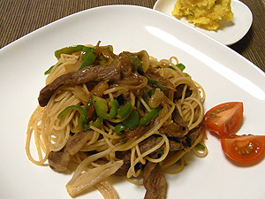 玉ねぎとピーマンと炒めて、これまた播州産の焼肉のタレに