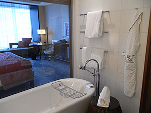 上の写真からバスルームに視線を左に移すと、バスタブがあり、その向こうはなんとガラス張り!