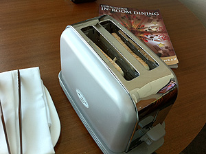で、トーストなのですが、てっきりトーストしたものが何かしらで保温された状態で持ってきてくれるのかと思いきや、おもむろにテーブルの上にポップアップトースターを設置し、「焼き始めてもよろしいでしょうか」と尋ねるではありませんか。