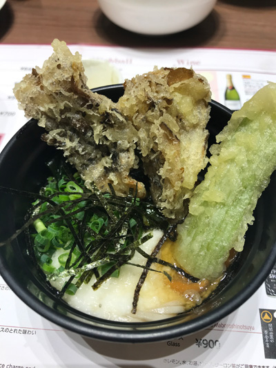幌加内そばに、十勝産長芋とろろと足寄町ラワンぶきと愛別町舞茸の天麩羅をトッピング。
