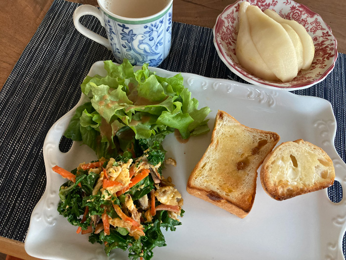 生で食べられるケールを買ったのでサラダにもしていますが、同時に買っていたフリルレタスもあったので、今朝のケールはたまごやニンジンなどと一緒に炒めました。