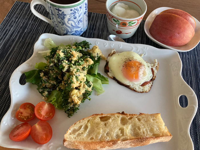 ハムエッグは、最近丸いままでなく半分に切ってその間に卵を落とすようにしてできるだけ真ん中に安定するようにして見ています。