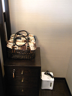 このような オープンなクローゼットになっていて、温泉の大浴場に行く時の為のかごや、セーフティーボックス、加湿器がありました。