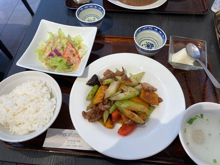 とにかくシャキシャキしたセロリがやはり飲食店ならでは美味しさです。スープはすっきりしていて、サラダは胡麻ドレッシング、ジャスミン茶と杏仁豆腐でバランスの良い定食でした。