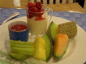 左上の器には、オレンジジュース付けの果物盛り合わせ。お茶請けにはとてもよいです。
