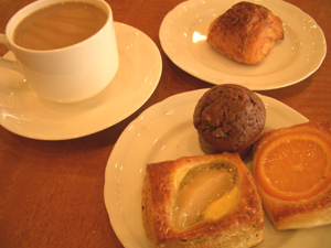 下のお皿は私のお代わり。前回はお食事パンだったので、デザート代わりにデニッシュ系やチョコマフィン。