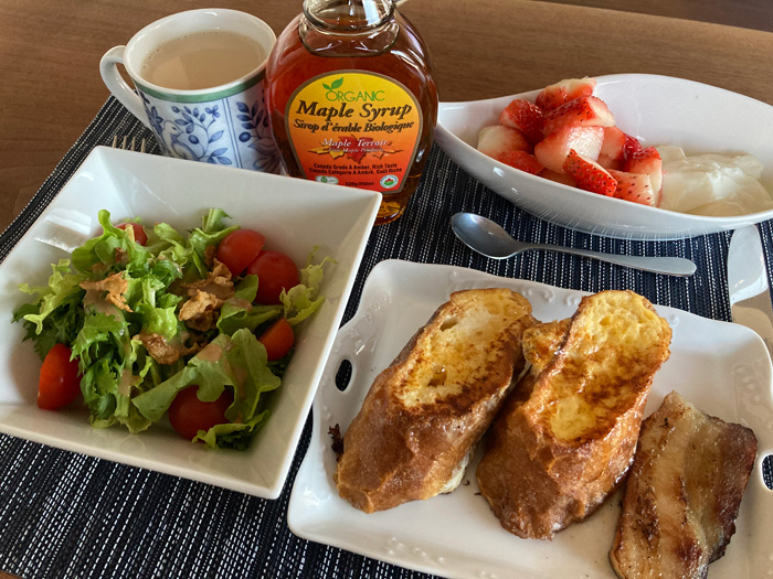 久しぶりにフレンチトーストにしました。昨夜のうちに卵と牛乳の液に漬け込んで置いたので、朝はバターで焼くだけでした。ベーコンとメープルシロップで甘じょっぱい感じに。久しぶりに食べるとやっぱりおいしいです。