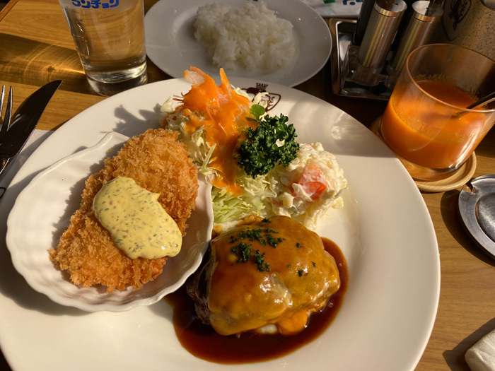日替わりランチ1,000円のメニューはチーズハンバーグ&サーモンフライでした。ごはんは少な目にしてもらっています。人参のドレッシングのサラダも含めて、やはり相変わらずの美味しさでした。