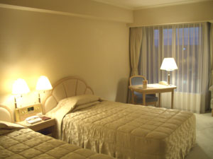 右手前のキャビネットにはTVが収納されていて、このTVが一工夫あって面白かったです。モーニングコールを電話でセットしておくと、電話が勿論なるのですが、TVが自動でオンになり、日航ホテルの外部カメラが前の通りを映し出す映像が癒しの爽やかな音楽とともに流れるのでした。