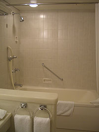バスルームに入って即、「あれ?トイレが無いよ?」と口走ってしまい、赤面。バスタブの手前、腰までの仕切りの向こうにひっそりと鎮座していました。