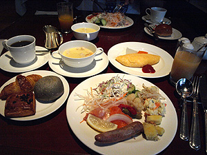 朝食は充実のラインナップ。パンも美味しくてついつい、食べすぎてしまう。