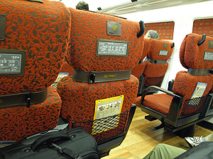 シートも軽快で、座り心地も割りと良いのです。なんか昆虫みたいなシートですが、カワイイなあ。飲み物やサンドウィッチやあんぱんなどを席で購入できるスタイルは、小田急ロマンスカーっぽい感じ。