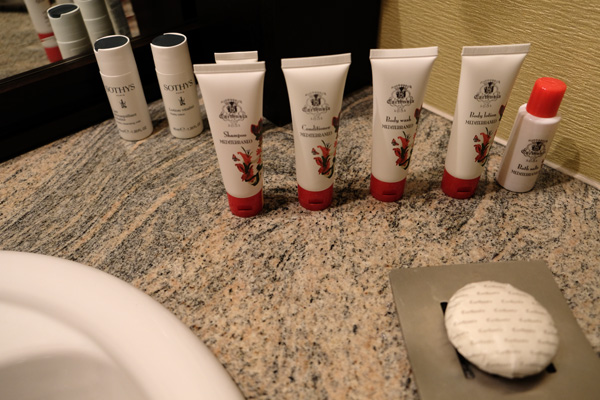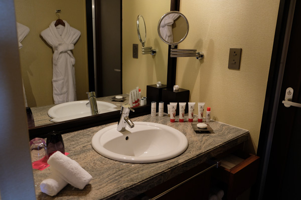 アメニティは充実。寝間着の他にバスローブもあります。ブラシがリッツカールトン大阪と同じくらい良いものだった…なんとなく私の中の指標だったり。