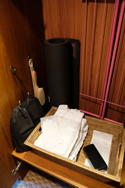 クローゼットには、ヨガマットや履き心地のよいふかふかスリッパの他、ホテルのアメニティとしては初めての経験の手袋です。