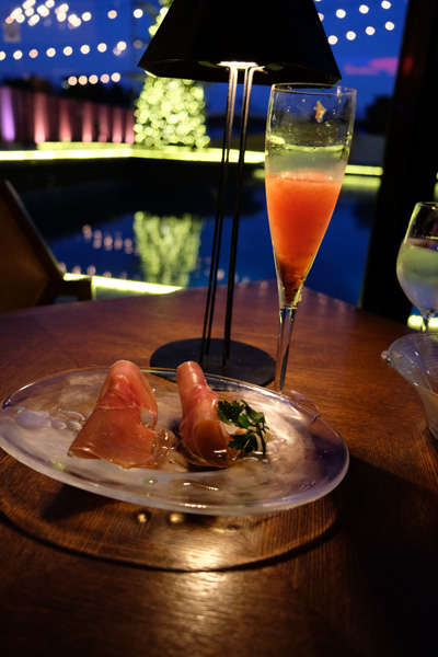 夫はカンパリグレープフルーツ -カジュッタ- で、カンパリシャーベットにグレープフルーツ果汁を注ぐカクテル。実は昨夜宿泊したドーミーインの朝食では、以前泊まった時に朝食でこのタイプのフレッシュグレープフルーツジュースが提供されていて、あのジュースを飲みに朝食リピートしても良かったよねという反省もありました。しかしここで出会えたからいいか、ということで。(また引き摺ってた…)私は自家製ノンアルコールサングリアで、洋梨の香りがします。