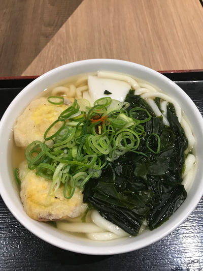 6時40分の飛行機のため朝食は空港についてからにしようということに。機内ではスターフライヤーだったのでタリーズのコーヒーにチョコレートと行きたい処ですが、空腹時にコーヒーはつらいので断念。温かいミネストローネスープを頂き少しお腹を落ち着かせておいての、因幡うどん。ごぼう天うどんが博多うどんの代名詞と言われていますが、私は芋天か丸天ばかりでしたので、今回は自分の懐かしい芋天530円にわかめ80円トッピングで。