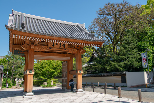 お寺のあるエリアへの入り口には、数年前に建てられた博多千年門がお出迎えです。まだまだ真新しさを醸し出していますが、これが次第に渋さを増していくんだろうなあ。「博多千年」の文字は、太宰府天満宮宮司でもあり、菅原道真の子孫でもある方によるものだとか。