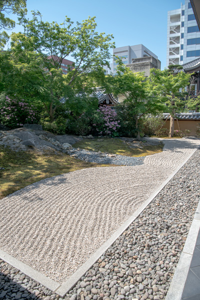 向かいの祇園山笠のオブジェの展示のあるお堂の横を通って正面に回ったところ。