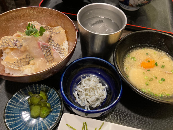 焼き鳥屋さんなのにランチメニューの中の、明石締め鯛の利休丼1,100円が好みドンピシャだったのでそちらにしました。熱々の豚汁も嬉しい。