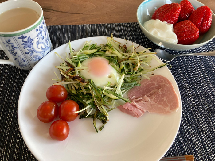 少し焦げてしまいましたが、ズッキーニと水菜の巣篭り卵。ハムも千切りにして混ぜようかと思ったのですが、何かバタバタしてそのまま添えることになったようです。朝の時間ってなんであっという間に過ぎるのだろうと不思議です。