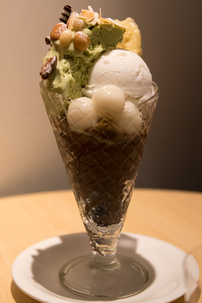 木の実がたくさんトッピングされていて、ピスタチオのアイスクリームに下はピスタチオに負けないくらい濃厚なチョコレートアイスクリーム。