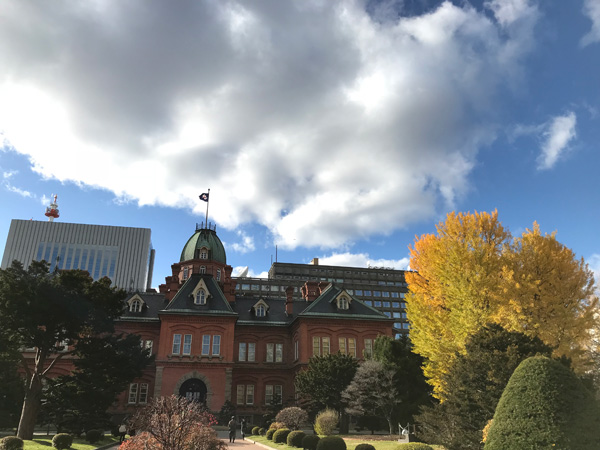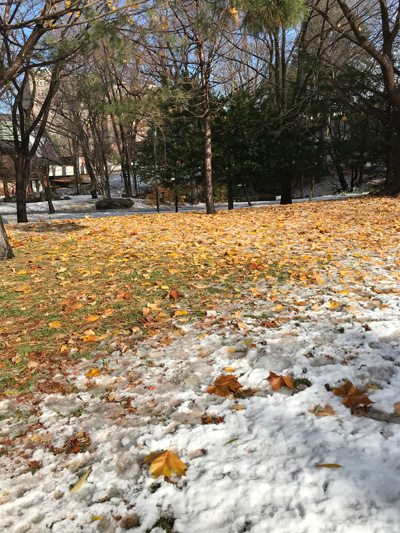 夜のうちに雪が降り積もり、北海道らしさが急激に増してワクワクしてしまいます。朝には雨になっていて、それがちょうどチェックアウトの10時頃に止むという奇跡が起き、北大をまずはなんとなく散歩して北海道の冬の空気を楽しみました。