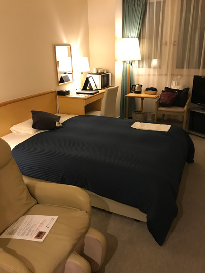 札幌にお誘いいただいてから探し始めたホテル、ダブルルームのシングルユースでやっと見つけることができた有り難い一室です。ミネラルウォーターと女性にはアメニティのプレゼントがありました。クタクタの足や腰をマッサージ機で揉みほぐし。