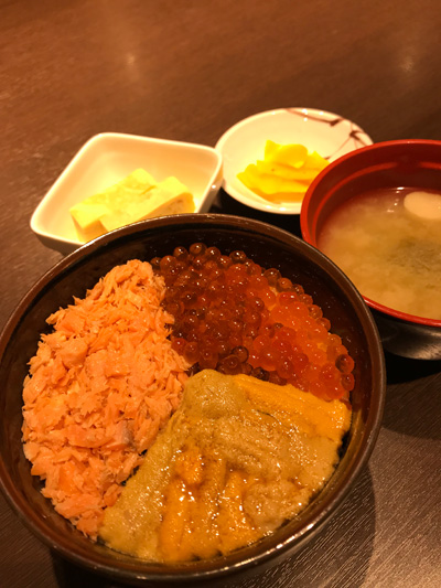 海鮮丼は3種欲しい、でも貝類甲殻類は選べないので三種お好み丼1,980円の選択肢は自然とうに・いくら・さけフレークとこうなります。ミニサイズの丼もありましたが、レギュラーサイズでここはぜひしっかりと北海道を味わって帰りたいと思います。