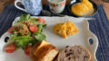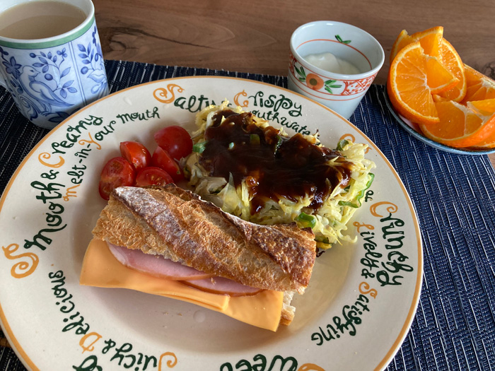 後はバゲットでハムチーズサンドにして、ミニトマトと。オレンジはスマイルカットにしています。時々違う切り方にしてみますが、やっぱり食べづらいのでスマイルカットに戻ります。