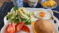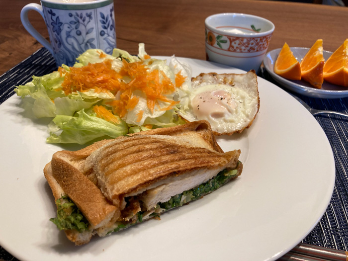 今朝のホットサンドでは、冷凍していたチキンカツとセロリの葉部分を合わせてチーズとともにサンドしました。大好きなセロリの風味も効いていて、なかなかいい感じ。