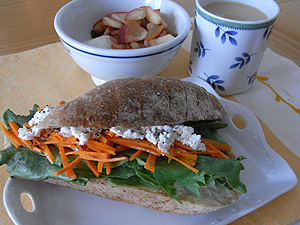 ちなみに、片方にはマヨネーズを薄く塗り、レタスを敷き、人参のラペとカッテージチーズを乗せ、