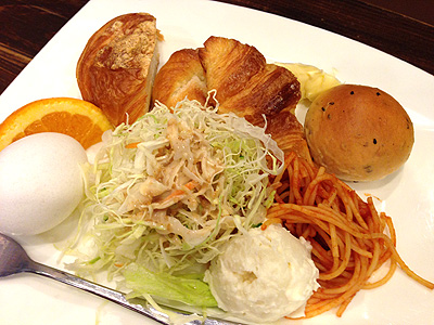 喫茶店の定番ナポリタン的なもの、キャベツ、ゆで卵、ポテトサラダ、オレンジとあって、これは近くにあると便利そうです。